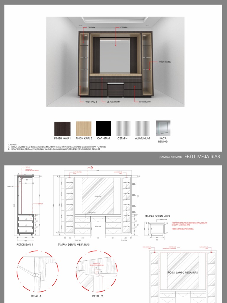 Gambaran kerja atau DED adalah tahapan dimana arsitek merancang gambar kerja detail dengan skala perbandingan ukuran setelah tahapan desain skematis dan design development dilakukan. Pilihan terbaik jika Anda. Body kabinet HPL motif kayu pintu laci HPL putih pintu bronze mirror Ambalan t5cm L30cm indirect lamp.
